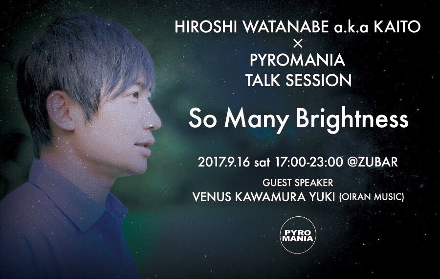 2016年10月。秋が深まりを見せた頃、東京・恵比寿を拠点にジャンル、世代、性別を超えて様々な音をジョイントするオリエンタルアンダーグラウンドパーティ集団「PYROMANIA」がこの日原宿のアートスペース「GALAXY銀河系」にてHIROSHI WATANABEをはじめとした超豪華ゲスト陣を招聘し、新パーティ「So Many Brightness」を立ち上げた。SNSの活用により未だかつてない程のスピード感でナイトシーンが加速する一方で、都市型パーティでは人と人、更にはアーティスト同士の繋がりが希薄になりつつある現状にカンフル剤を打つべく、「しぶや花魁」にて禁じ手ともいえる「現場入りギリギリまで懇親会」を敢行。結果としてこの翌日全メンバーが疲労困憊でゲッソリする事になるのだが、それ以上に普段のパーティでは知る由もないような各アーティストの想い、歴史、生活まで掘り下げた超濃厚エピソードを引き出した。