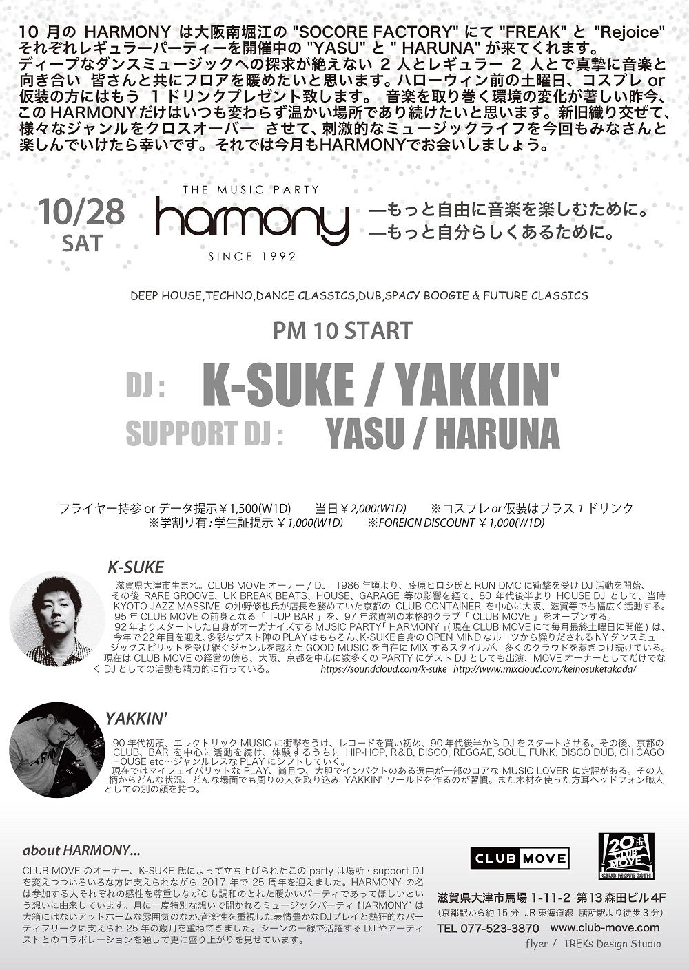 10月のHARMONYは大阪南堀江の "SOCORE FACTORY" にて "FREAK" と"Rejoice"それぞれレギュラーパーティーを開催中の "YASU" と " HARUNA" が来てくれます。