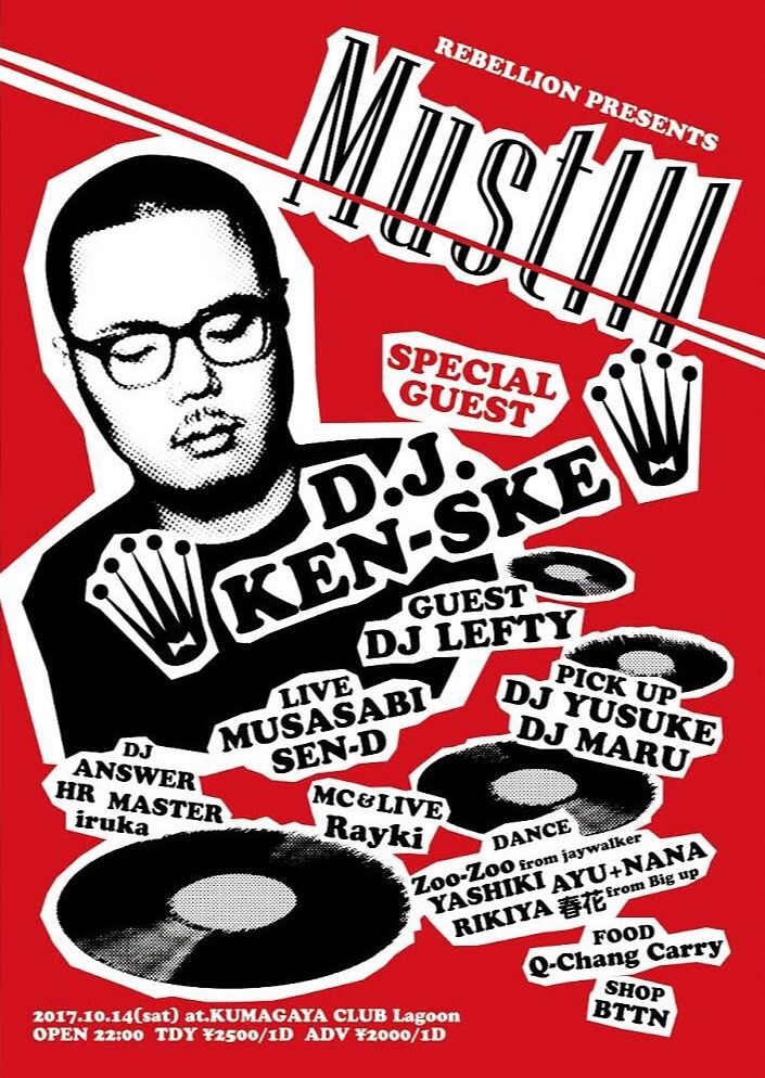 2017.10 14 OCT must!! HIPHOP R&B TOP40 ALLMIX 0 Shares Facebook Twitter google Line DATE: 2017-10-14 SAT OPEN: 22:00 VENUE: PRICE: ADV: 2,000yen/1D DOOR: 2,500yen/1D LINE UP: ■SPECIAL GUEST DJ KEN-SKE ■GUEST DJ LEFTY ■PICK UP DJ YUSUKE DJ MARU ■LIVE MUSASABI SEN-D ■MC&LIVE Rayki ■Dancer Zoo-Zoo from jaywalker YASHIKI AYU+NANA RIKIYA 春花 from Big up ■DJ ANSWER HR MASTER iruka ■FOOD Q-chang curry ■SHOP BTTN DJ ANSWER主催イベント「MUST!!」 今年2度目のMUST!!!はSpecial GUESTにDJ KEN-SKE! 「音で盛り上がる最高のPARTY」をテーマに毎回、 オープンからラストまで良質なDJがお客様を最高PARTYに導きます。 この一夜でしか味わえない最高PARTYを体感せよ!! ●HIP HOP, R&B, CLASSICS, DANCE MUSIC & ALL MIX PARTY!!