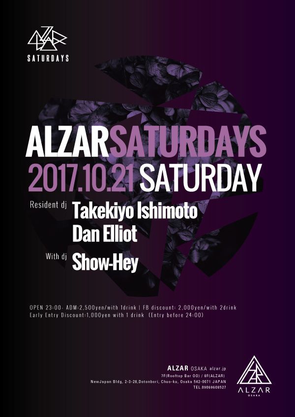 大阪を拠点に活動する数多くのDJから選び抜いた5名を土曜日のレジデントとして迎え入れ、国内をはじめとした各地に点在する優れたアーティストを共演者として招聘し開催するALZAR Saturdays。第3土曜日は、Progressive Houseを軸に、DeepなTranceや疾走感のあるTechnoなど、現場の雰囲気から思い描いたストーリーを基にMixするTakekiyo Ishimotoと、Progressive House&TribalからTech House&Technoへと幅広い音楽を操り、常に完璧なmixと音楽でダンスフロアを盛り上げ、決してクラバーの期待を裏切らないDan Elliotの2人がレジデントを務める。