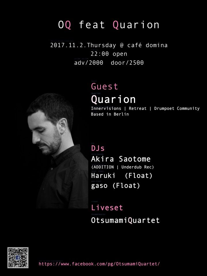 2017.11 02 NOV OQ feat Quarion TECH HOUSE DEEP HOUSE TECHNO 0 Shares Facebook Twitter google Line DATE: 2017-11-02 THU OPEN: 22:00 VENUE: PRICE: DOOR:¥2500 ADV:¥2000 LINE UP: Guest : Quarion (Innervisions | Retreat | Drumpoet Community | Berlin) DJs : Akira Saotome(ADDITION | Underdub Rec) Haruki(Float) gaso(Float) Liveset : OtsumamiQuartet GuestはBerlinからSession VictimとともにRetreatを率いるQuarionが登場! また、ADDITIONのAkira Saotome、勢いのある若手のHarukiとgaso、そしてOtsumami QuartetがバンドスタイルのLiveで迎え討ちます。 https://m.soundcloud.com/quarion/164-feet-field-elevation-dj-mix