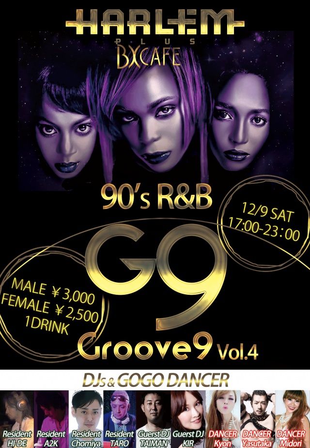 渋谷Harlemで年に2回開催される90sR&Bのビッグイベント!それが"Groove9" 幅広い世代の90sR&Bフリーク方達で毎回大盛況! まだ体験してない方や興味が沸いたあなたは、ぜひ体験してください。 今回もDJ陣に、J-WAVEの人気番組"SATURDAY NIGHT VIBES”他多数のメディアで活躍中のDJ TARO。 ”六本木GASPANIC” ”西麻布J-TRIP BAR” “六本木エロス” “六本木R HALL”等のクラブでレジデントやイベントで活動しGroove9のオーガナイザーでもあるDJ Chomiya。 ”新木場Ageha”等のクラブイベントで活動し現在は"銀座Soul Sonic Boogie”で活動中のDJ HI-DE。 30代ながら90’sR&BやNew Jack Swingにも造詣が深い DJ A2K。 そしてGuestDJには、PCを使用せず全てアナログで昔ながらのプレイをスタイルとするDJ TAIMAN。 そして紅一点!"J-TRIP BAR” “六本木CORE” "芝浦VENUS TOKYO” "横浜 FIRE” “渋谷XANADU” "青山M.(ミューズ)” 銀座GENIUS TOKYOのレジデントを勤めた実力派女性DJ KIR。 90'sR&Bを知り尽くした叩き上げの本物のクラブDJ達を揃えました。 更にこのイベントに欠かせないスペシャルなGOGO DANCERも出演! GOGOダンサー界の重鎮Kyon&Midori。 そしてポールシアターワールドコメディ部門優勝者のYsutakaを加えた超強力なダンサー陣! 最高にCrazyでCoolでSexyなハーレムの夜に酔いしれてください!