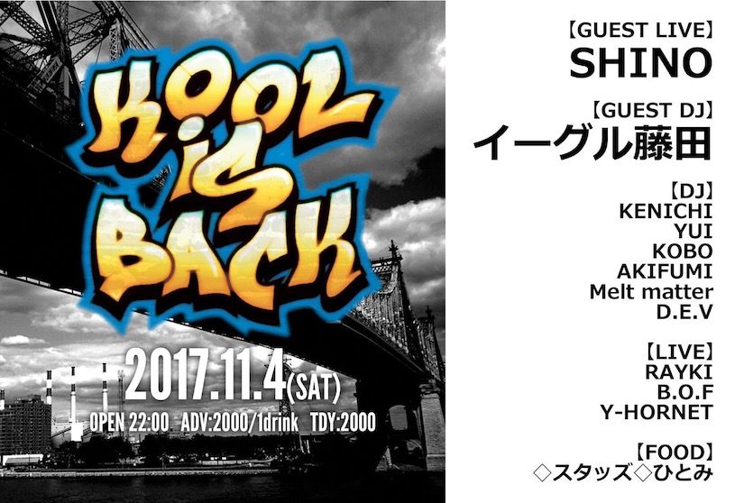 "KOOL IS BACK" 2017.12.2(Sat) 22:00〜 ゲストに2ndアルバム"BURBS"を出したSHINO君とFRESHMENイーグル藤田を招いて、北埼玉×西東京HIPHOPをおっ届け‼︎ 踊れー‼︎(Rayki)