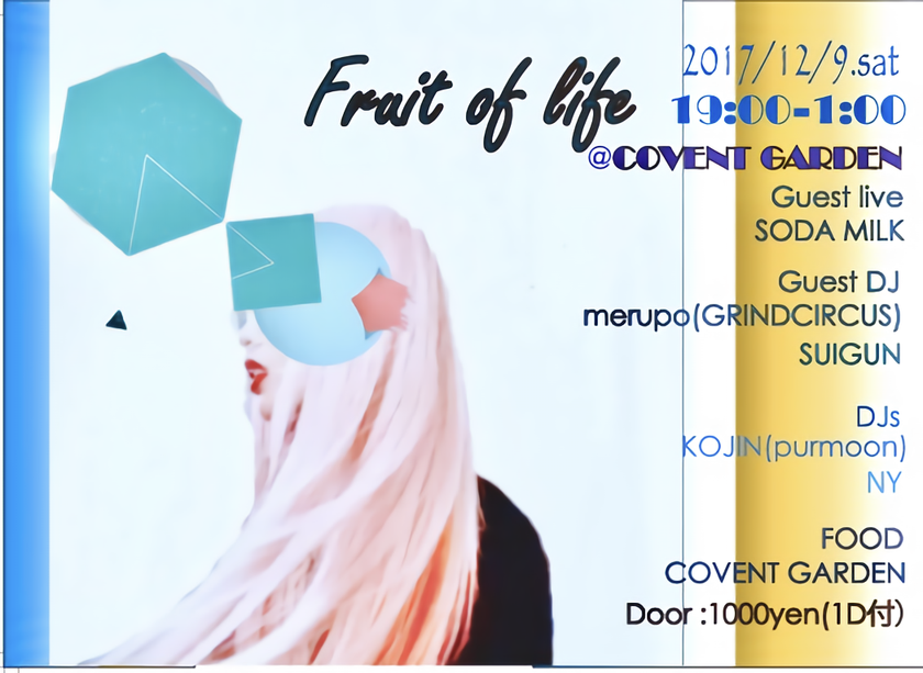 2017.12 09 DEC Fruit of life ELECTRO BASS MUSIC DRUM&BASS DISCO CROSSOVER 0 Shares Facebook Twitter google Line DATE: 2017-12-09 SAT OPEN: 19:00 VENUE: PRICE: Door:1000yen (1d込) LINE UP: Guest live soda milk Guest DJ merupo(GRINDCIRCUS)、SUIGUN DJs Kojin(purmoon),NY All of dance music party!! 19:00-1:00 Hardtek -electro -drum’n’bass-nudisco-ambient -progressive music etc! Have fun!! https://soundcloud.com/jdfgfgghfg/sononstopthemusic soundcloud.com/merupo