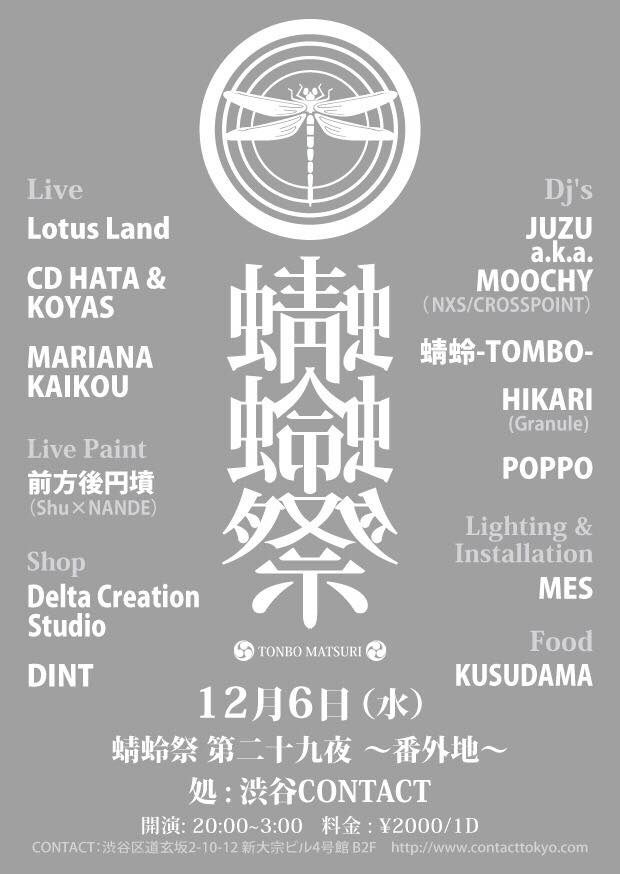 DJ/トラックメイカーの蜻蛉-TOMBO-によって開催され、数々の熱狂的な夜を生み出してきた乱痴気大騒動 蜻蛉祭の番外地を渋谷Contactで開催。ジャンルにとらわれず魂を揺さぶるアーティスト達が集結し魂の解放区を作り上げ、二度とない、この日を祭り上げる。
