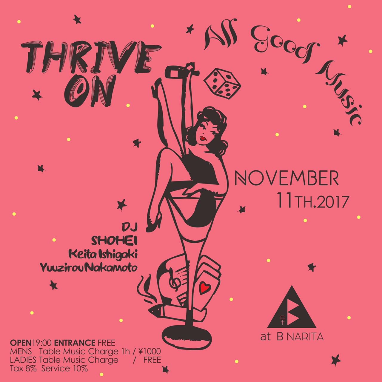 前回10月21日(Sat)に【"THRIVE ON" ▲ at B NARITA】と称して開催し、大盛況だったこのパーティが11月11日(Sat)に第2回目の開催を迎えます!