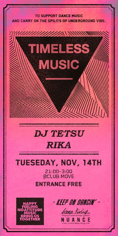 85年より渡米。98年帰国。Dance Musicをサポートする為にtimeless-music djs & associatesを立ち上げ、京都lab tribeにてレジデンスパーティー「Danceteria」をスタート。現在は滋賀Stgw basementにて不定期にpartyを開催。