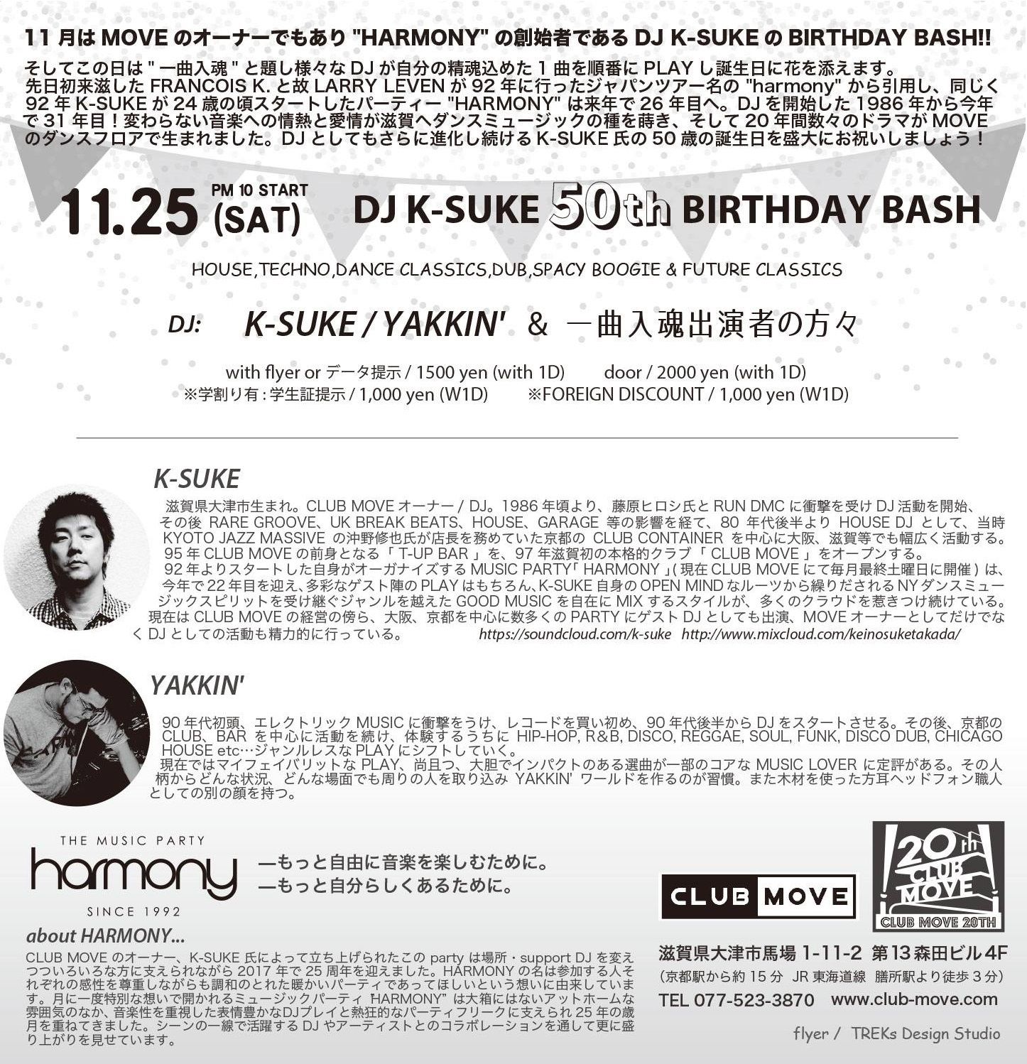 先日初来滋したFRANCOIS K.と故LARRY LEVENが92年に行ったジャパンツアー名の "harmony" から引用し、同じく92年K-SUKEが24歳の頃スタートしたパーティー "HARMONY" は来年で26年目へ。DJを開始した1986年から今年で31年目!変わらない音楽への情熱と愛情が滋賀へダンスミュージックの種を蒔き、そして20年間数々のドラマがMOVEのダンスフロアで生まれました。DJとしてもさらに進化し続けるK-SUKE氏の50歳の誕生日を盛大にお祝いしましょう!