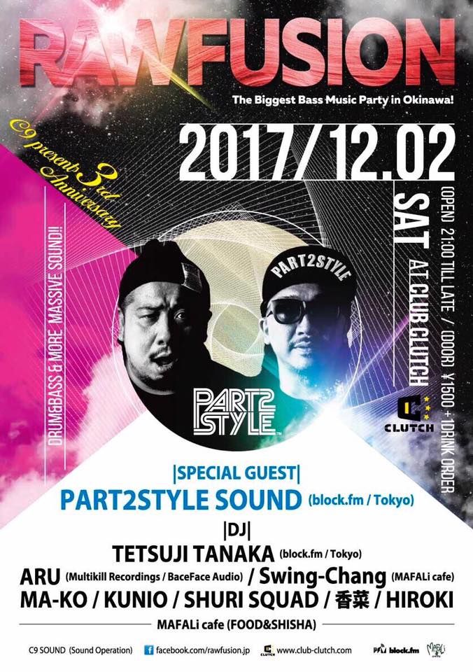 C9 presents 新生RAWFUSIONになり3周年記念として PART2STYLE SOUND をスペシャルゲストに迎え、沖縄Bass Musicシーンに新たな歴史を刻むべくCLUB CLUCTHにてRAWFUSION 開催。