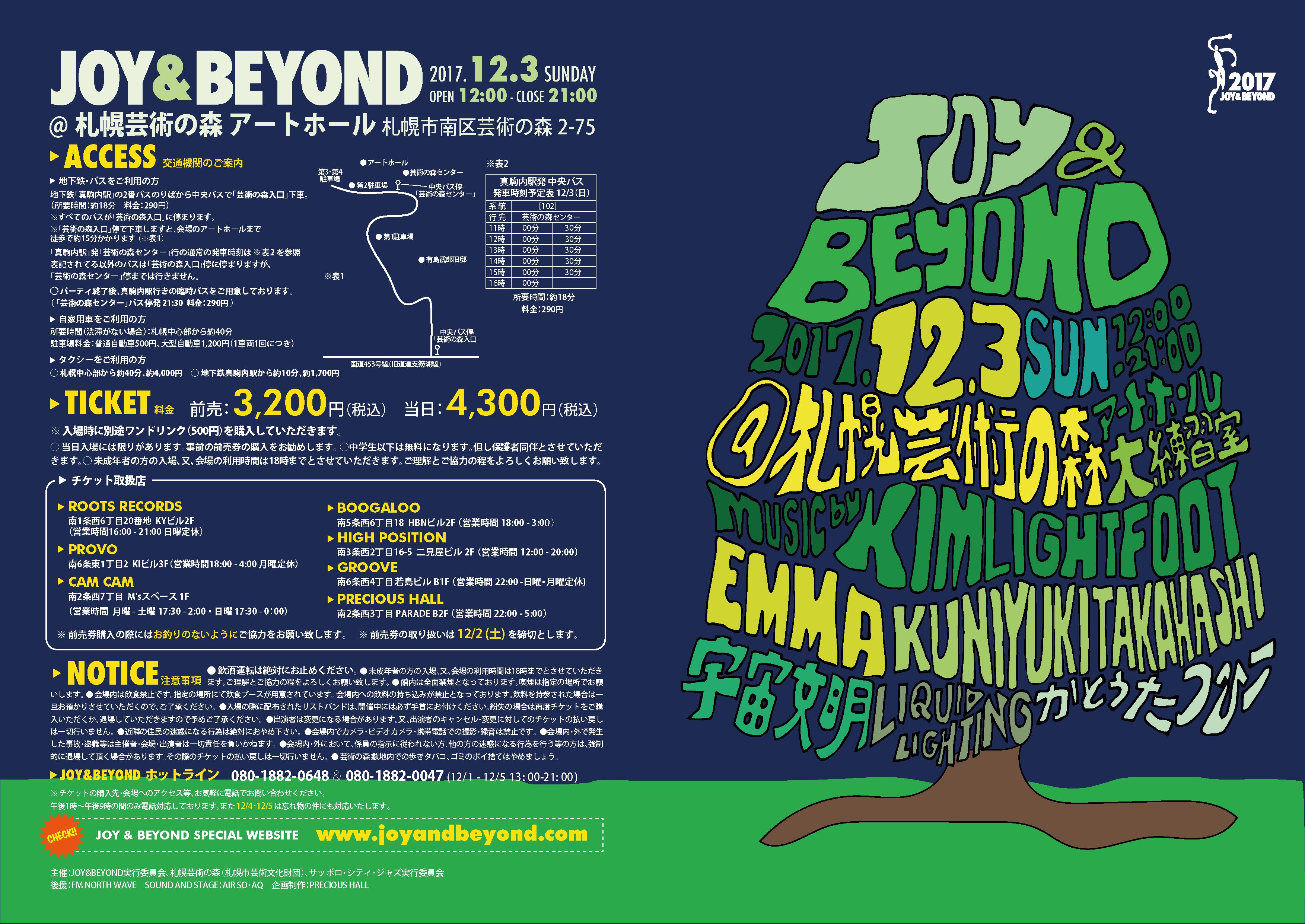 2017.12 03 DEC JOY & BEYOND PICK UP HOUSE 0 Shares Facebook Twitter google Line DATE: 2017-12-03 SUN OPEN: 12:00 VENUE: PRICE: ADV/3.200 DOOR: 4.300 LINE UP: MUSIC by KIM LIGHTFOOT DJ EMMA、KUNIYUKI TAKAHASHI、宇宙文明 LIQUID LIGHTING:かとうたつひこ http://www.joyandbeyond.com