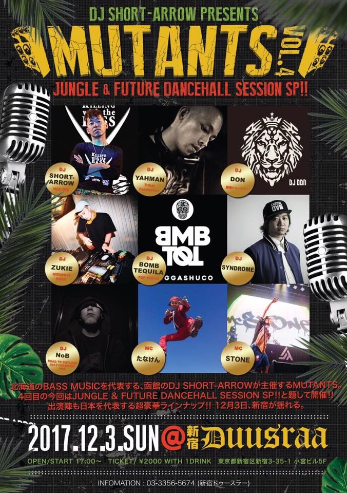 北海道のBASS MUSICを代表する、函館のDJ SHORT-ARROWが主催するMUTANTS。4回目の今回はJUNGLE & FUTURE DANCEHALL SESSION SP!! と題して開催!!