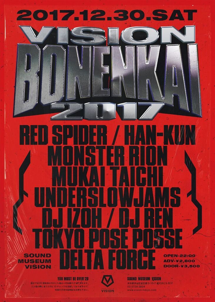 VISION BONENKAI 2017と題したこのパーティーに、RED SPIDER、HAN-KUN、MONSTER RIONらが登場!!!