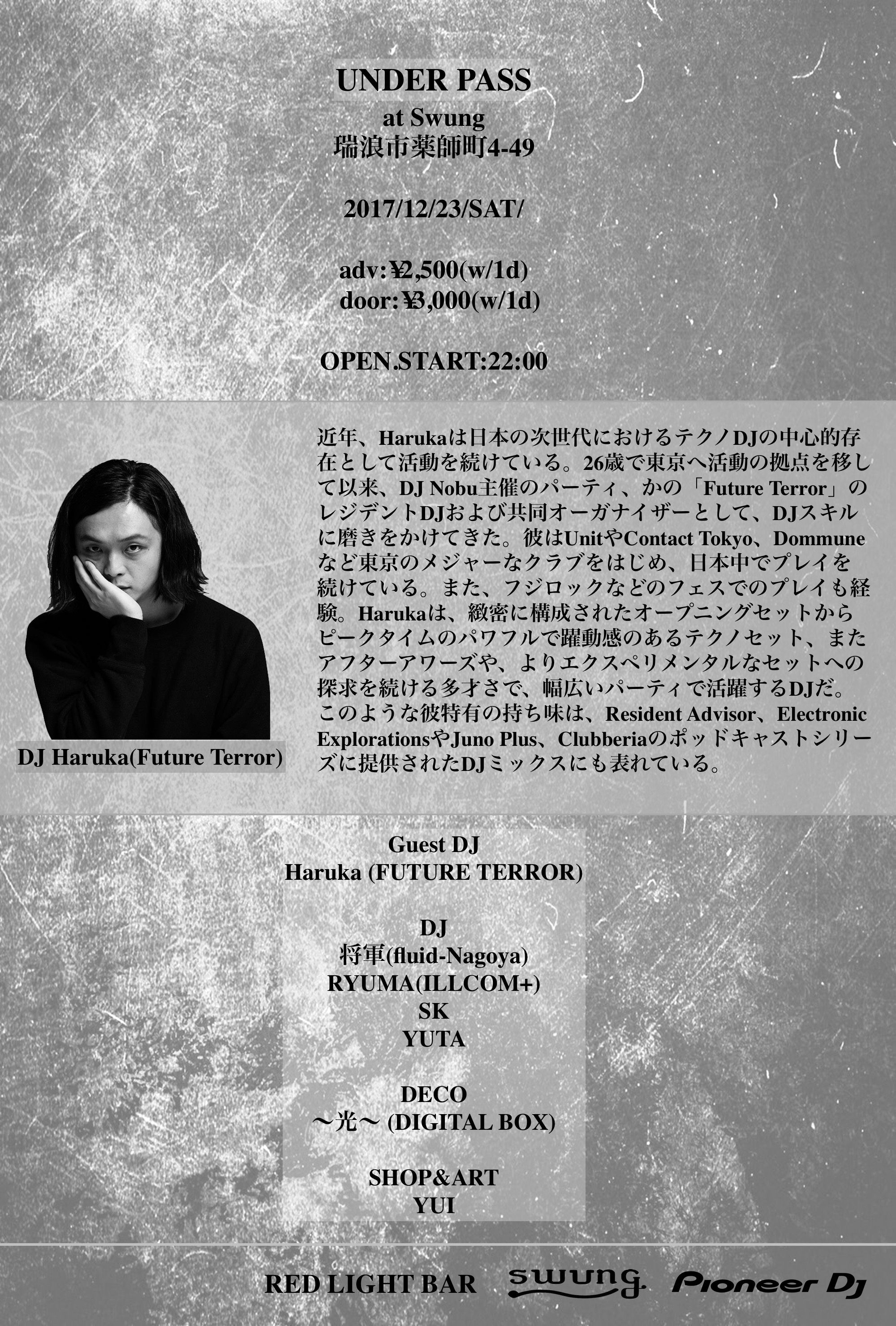 近年、Harukaは日本の次世代におけるテクノDJの中心的存在として活動を続けている。26歳で東京へ活動の拠点を移して以来、DJ Nobu主催のパーティ、かの「Future Terror」のレジデントDJおよび共同オーガナイザーとして、DJスキルに磨きをかけてきた。彼はUnitやContact Tokyo、Dommuneなど東京のメジャーなクラブをはじめ、日本中でプレイを続けている。また、フジロックやRuralなどのフェスでのプレイも経験。Harukaは、緻密に構成されたオープニングセットからピークタイムのパワフルで躍動感のあるテクノセット、またアフターアワーズや、よりエクスペリメンタルなセットへの探求を続ける多才さで、幅広いパーティで活躍するDJだ。このような彼特有の持ち味は、Resident Advisor、Electronic ExplorationsやJuno Plus、Clubberiaのポッドキャストシリーズに提供されたDJミックスにも表れている。またコンスタントなDJ活動に加え、DJ Yaziとのユニット「Twinpeaks」では、即興的なライブアクトを実践している。2016年のFuture Terrorニューイヤーパーティで披露した長時間のクロージングセットは、彼の音楽的な方向性を象徴するとりわけ重要なセットであり、現在のプレイにも繋がるものである。