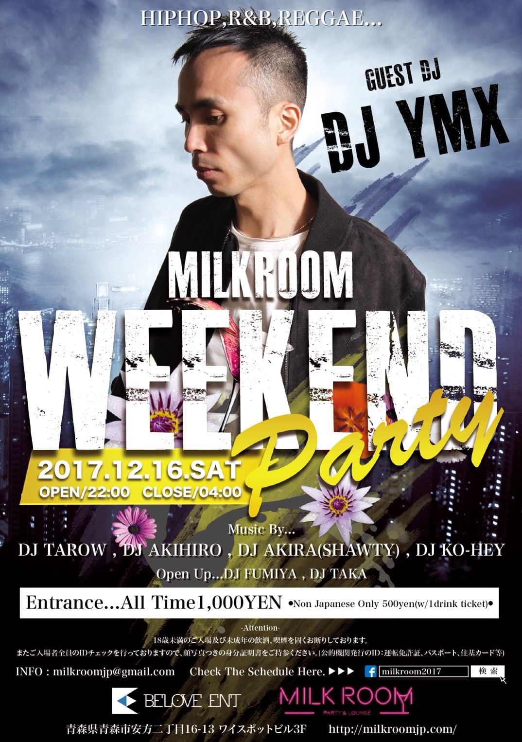 2017.12 16 DEC MILK ROOM WEEKEND PARTY HIPHOP R&B REGGAE TOP40 0 Shares Facebook Twitter google Line DATE: 2017-12-16 SAT OPEN: 22:00 VENUE: PRICE: ALL TIME¥1000 LINE UP: -guest DJ- DJ YMX -music by- DJ TAROW / DJ AKIHIRO / DJ AKIRA / DJ KO-HEY -open up- DJ FUMIYA / DJ TAKA
