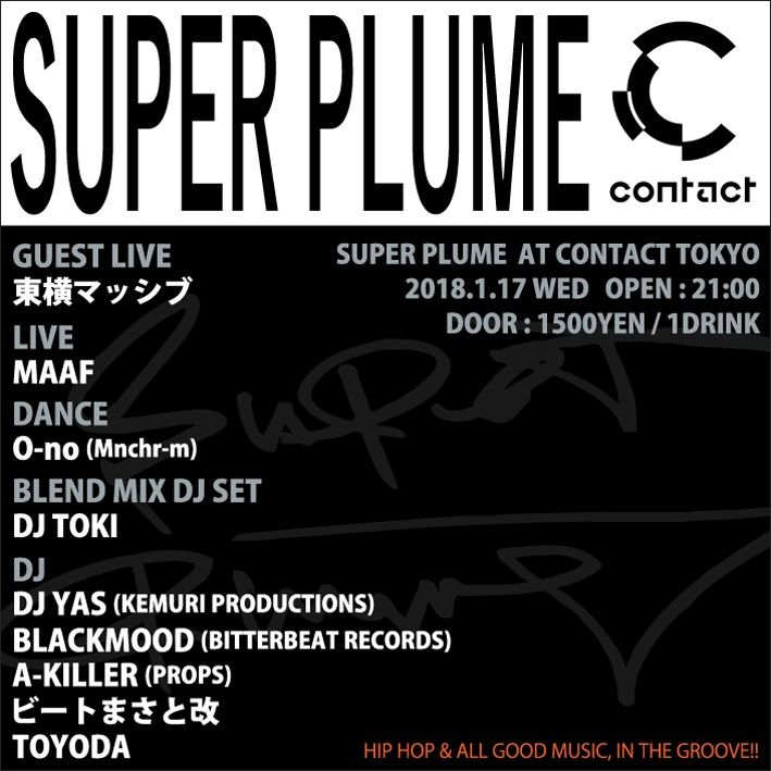 ブラックミュージックをメインにクロスオーバーなスタイルを提案する”Super Plume”ヒップホップを基軸にしながらも様々なバックグラウンドを持つアーティストがその枠組みに囚われないアートフォームを披露する。DJ陣にDJ YASをはじめ、BLACKMOOD、A-KILLER、TOKI、TOYODAといった様々な現場で活躍するDJが集い、ダンスにMnchr-m、前回よりライブにMAAFが加わり、良質な空間を作り上げる。今回、ゲストライブにファーストアルバム「TRIP TRAVEL TOUR」をリリースした東横マッシブが初登場する。