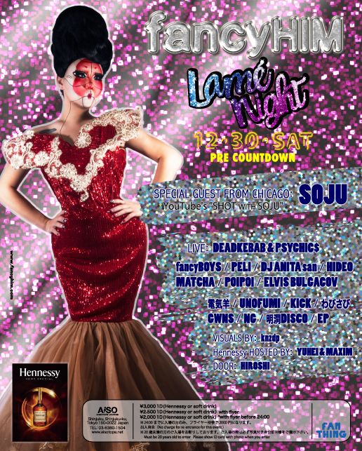YouTubeショー「Shot with Soju」の人気チャンネルを持つ、シカゴを拠点に活躍する韓国生まれのドラァグアーティスト、SOJUをスペシャルゲストに迎える他、東京をベースに活動するヒップホップユニットDEADKEBAB & PSYCHIC$が初登場!彼らの独特な世界観はフロアをロックすること間違いない!そして豪華レギュラー陣が今年最後のファンシーヒムをキラキラにするプレカウンドダウンパーティ!