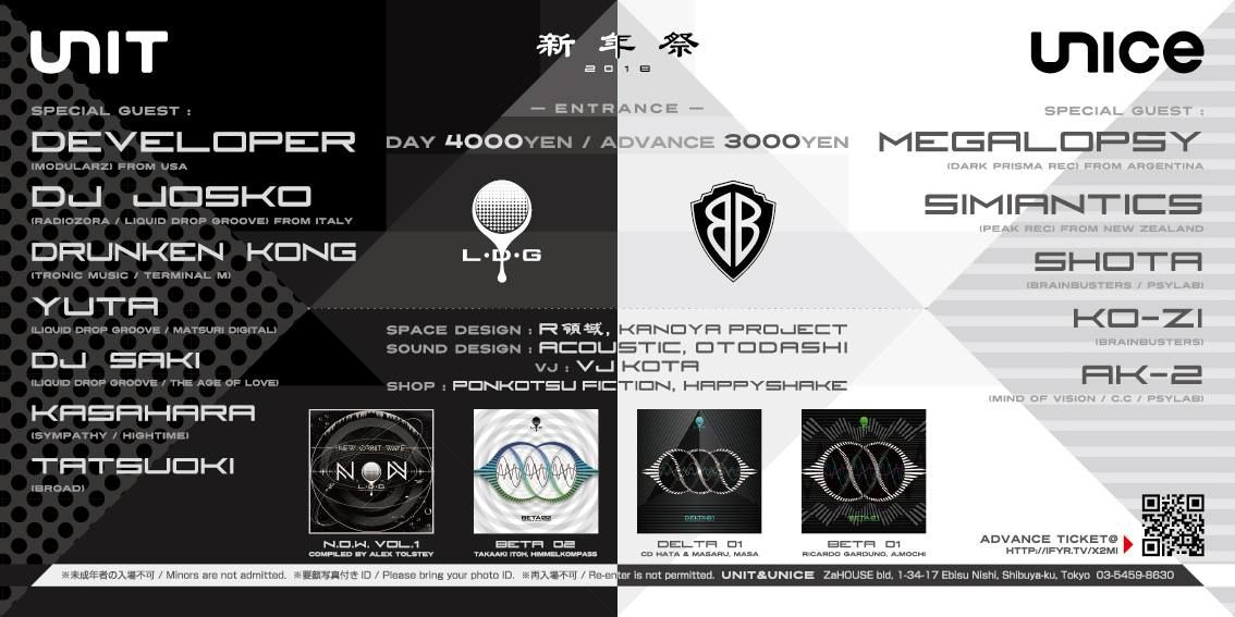 For celebrates coming year 2018, 2 floors party hold at Unit and Unice on 13th Jan 2018 with Techno label Liquid Drop Groove x Dark psy trance team Brainbusters and SYMPATHY.