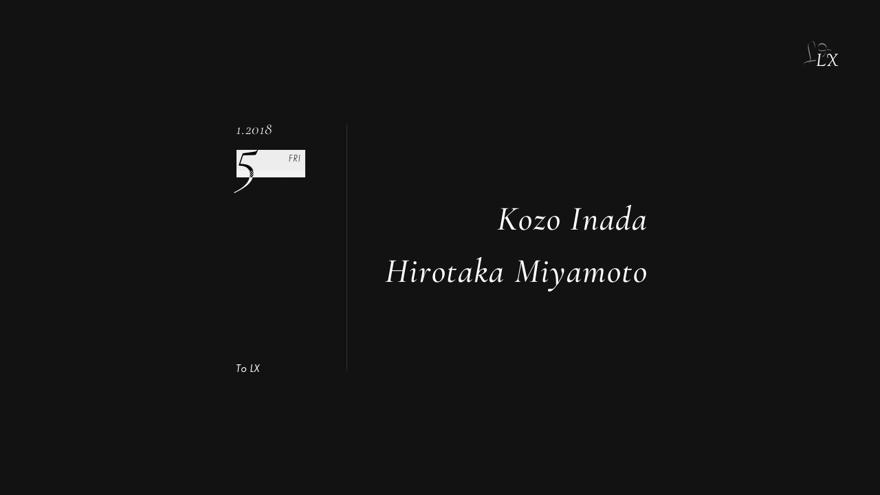 2018.01 05 JAN To LX TECHNO HOUSE MINIMAL ELECTRONICA 0 Shares Facebook Twitter google Line DATE: 2018-01-05 FRI OPEN: 22:00 VENUE: PRICE: Free LINE UP: Kozo Inada,Hitotaka Miyamoto,Shinya Okamoto http://leading-x.com/