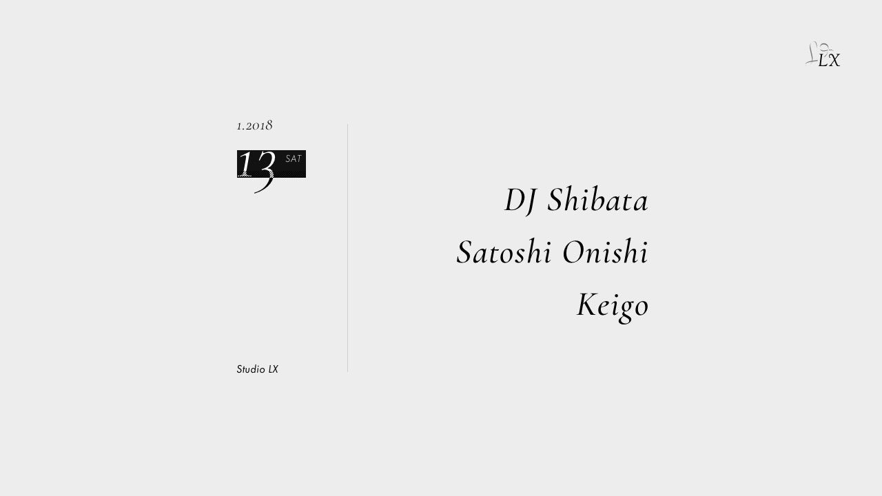 2018.01 13 JAN Studio LX TECHNO HOUSE 0 Shares Facebook Twitter google Line DATE: 2018-01-13 SAT OPEN: 22:00 VENUE: PRICE: Free LINE UP: DJ Shibata,Satoshi Onishi,Keigo Koda http://leading-x.com/