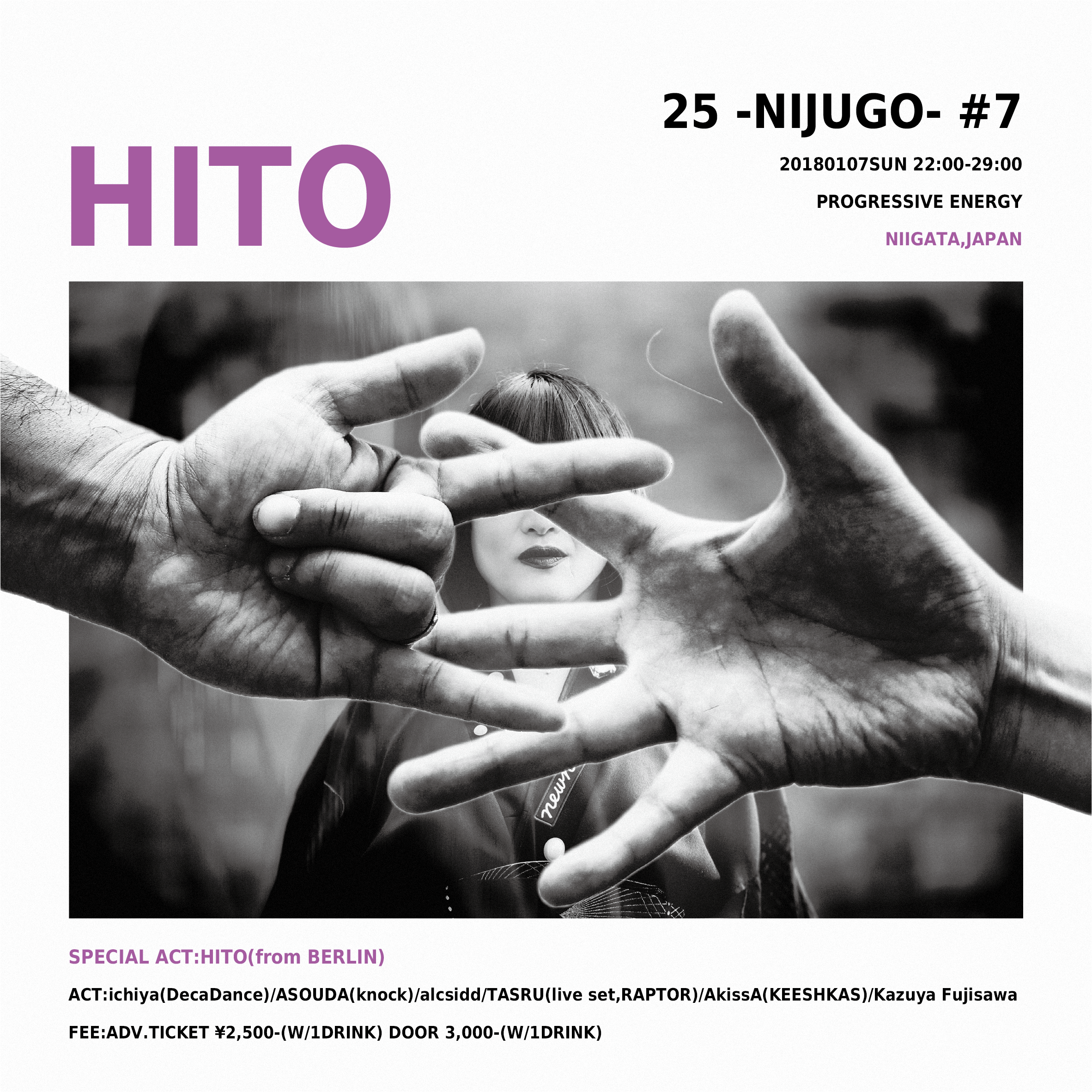 2018.01 07 JAN 25-nijugo- #7 feat.HITO TECHNO MINIMAL TECH HOUSE EDM ELECTRO 0 Shares Facebook Twitter google Line DATE: 2018-01-07 SUN OPEN: 22:00 VENUE: PRICE: ADV.TICKET ¥2,500-(W/1DRINK) DOOR ¥3,000-(W/1DRINK) LINE UP: MAIN ACT:HITO(from BERLIN) ACT:ichiya(DecaDance)/asouda(knock)/alcsidd/TASRU(RAPTOR)/Akissa(KEESHKAS)/kazuya fujisawa リッチー・ホウティンの懐刀としてENTER SAKEのレジデントを務めるHITOがベルリンより新潟の地へ。 先日発表されたコーチェラ2018にもラインナップされ、昨年はウルトラ、トゥモローランドなど数々のフェス〜自身のPARTY「OTO」をベルリンにてスタートさせるなど益々の活躍をみせるHITOによる冬の新潟GIG。 リッチーがアレヒのエンジニアと開発したプロユースミキサー「MODEL-1」帯同、エナジーのシステム「FUNKTION-ONE」との相性も楽しみ。