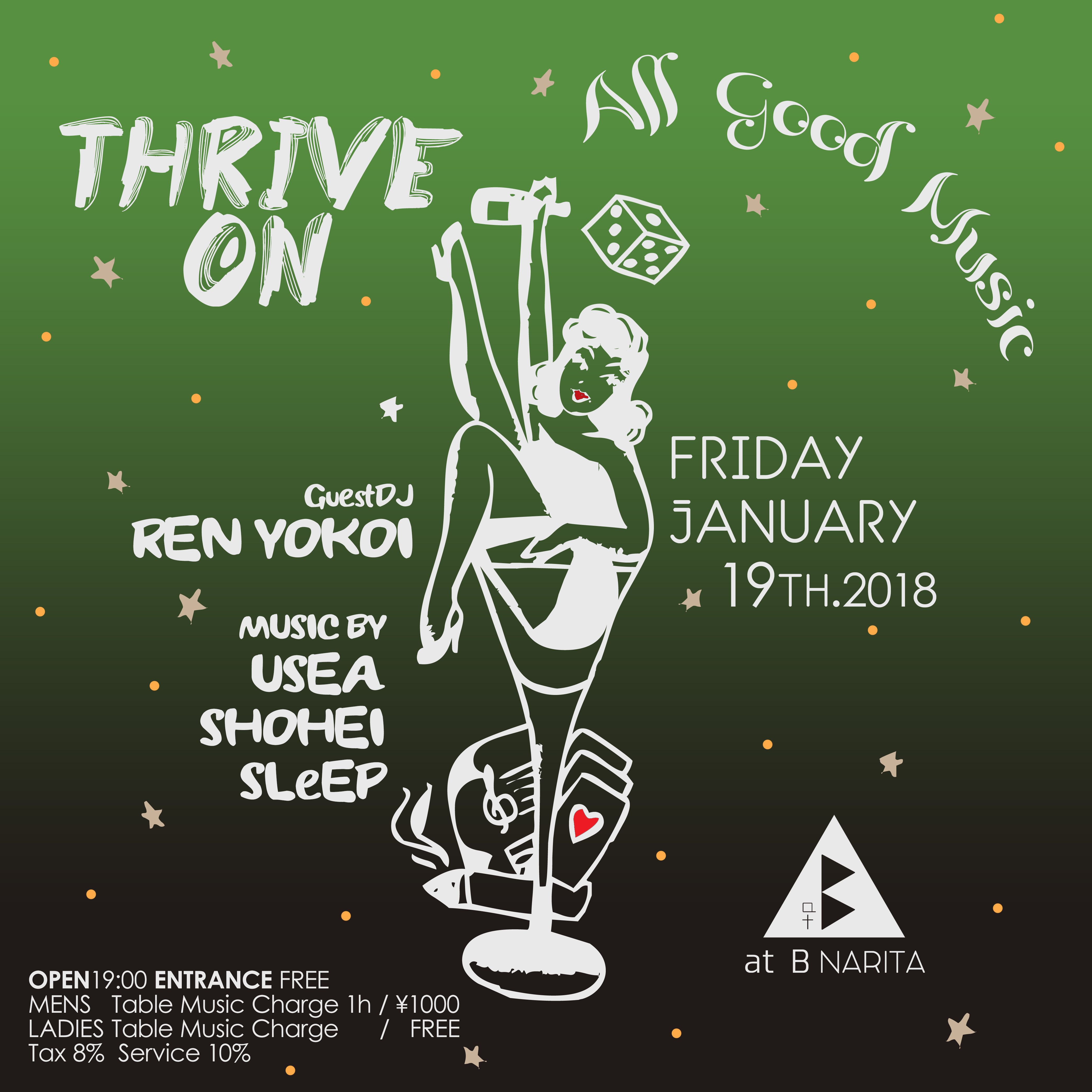 数多くの有名アーティストや業界関係者が集う渋谷BPM MUSIC BAR で、これからのダンスミュージックシーンを担っていくであろう若手DJを抜粋し、毎月発信しているウィークエンドパーティー "THRIVE ON"。