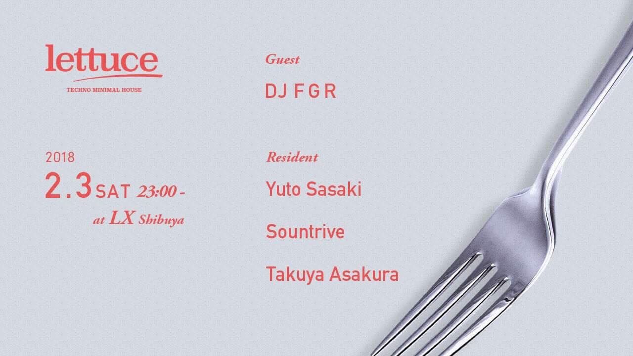 2018.02 03 FEB Lettuce HOUSE DEEP HOUSE TECHNO MINIMAL 0 Shares Facebook Twitter google Line DATE: 2018-02-03 SAT OPEN: 23:00 VENUE: PRICE: Free LINE UP: [Guest]DJ FGR,[lettuce crew],Yuto Sasaki,Sountrive,Takuya Asakura http://leading-x.com/