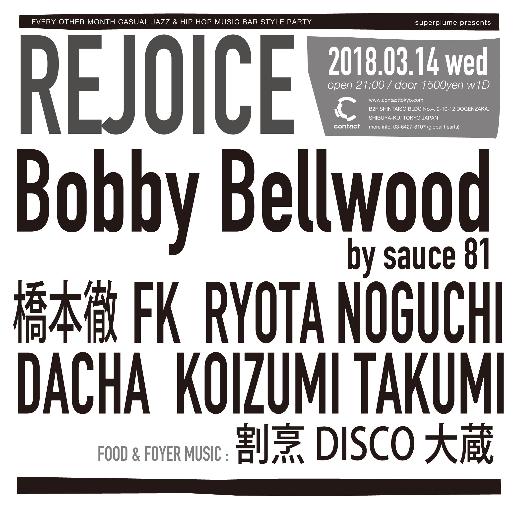 “Rejoice”は選曲家 橋本徹、Nujabesのマネージャーやレーべルマネージメントを務め、現在はRoph RecordingsをマネージメントをするKoizumi Takumi、Hydeout Productionsの旗艦店Tribe (+Guinness Records)からリリースし、同店のスタッフでもある FK、数多くのアーティストのエンジニアリング等を務め、自身でもjazz イベントを開催するRyota Noguchi、高円寺にあり毎晩DJによる選曲が楽しめる居酒屋割烹ディスコ大蔵の板前でもあり、楽曲制作等のプロデュースワークも手掛けるDacha(Zukijima)の腕利きのセレクターに加え、3月はsauce81がプロデュースするシンガーBobby Bellwoodがゲストで出演。鍵盤とドラムマシンを使ったソウルフルなカヴァー曲の弾き語りは必見です!さらに割烹ディスコ大蔵も出張営業。フードと音楽を是非楽しんで下さい。