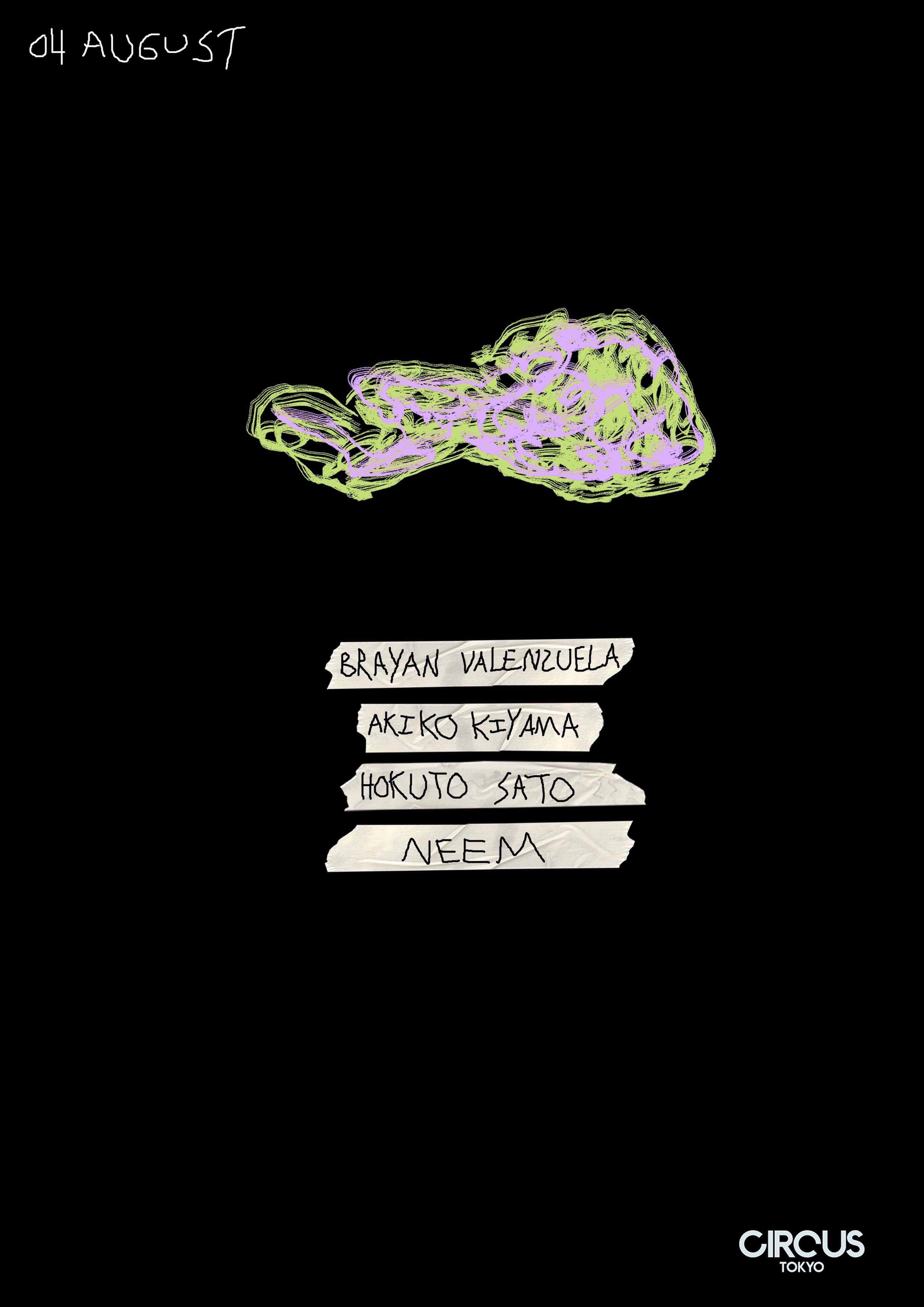 バルセロナよりMinimalistic Artと0000主宰のBrayan Valenzuelaが初来日公演を行う。Minimalistic Artより次回発表されるEPにRemixが収録される、Akiko Kiyamaと共演。その他、最近Vidとの共作でも注目が高まるAura Music主宰のHokuto SatoとMinimalistic Artから作品を発表しAura MusicからソロEPをリリースするNeemが共演。
