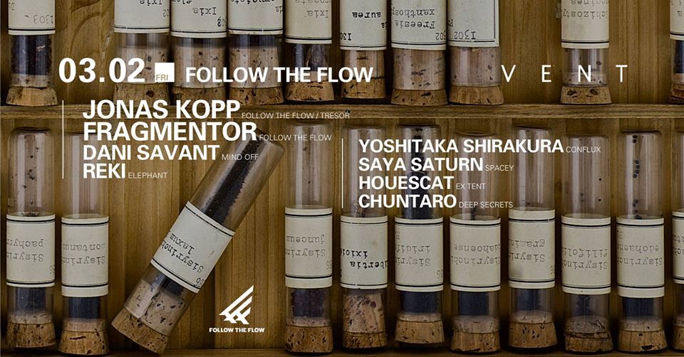 FOLLOW THE FLOWは、Frankie (Francesco Fondi, ex-UMM / Disturbance) と Stefano Lotti によって今回新しく立ち上げられる東京を拠点にしたテクノパーティー/レーベルである。エレクトロミュージックと自然(植物、昆虫学、民族植物学など)に焦点を当てたマルチメディアプロジェクトで、人々に自然な流れを作り、テクノロジーを通して自然を再発見する試みを行っていく。