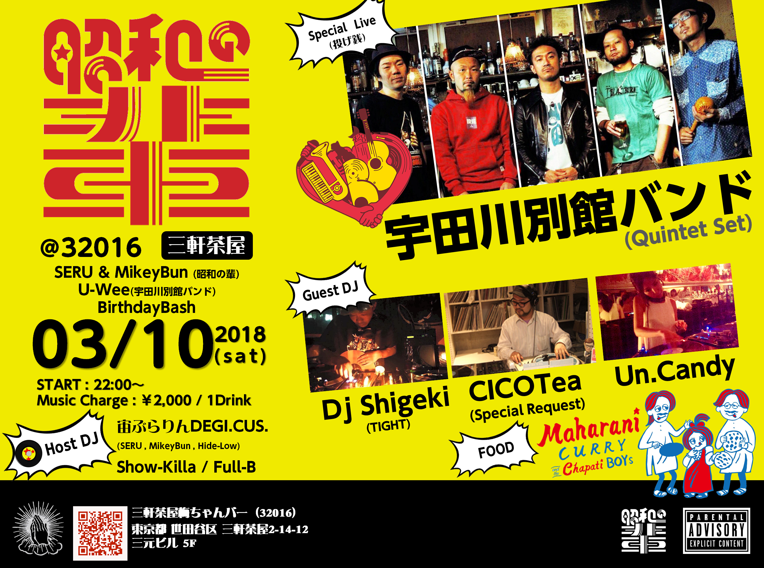 3月は輩のボス2人 SERU & MIKEYBUNが誕生日月、そして今回のLIVEに出演する宇田川別館バンドのU-Wee君も3/2生まれ!