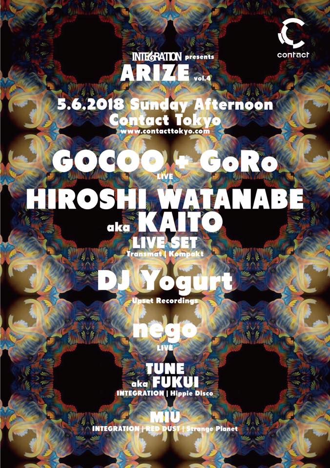 DJ、ライブ、アートや出店など各種コンテンツの融合をコンセプトに、独自の空間を築き上げるパーティINTEGRATIONが主宰する屋内フェス型パーティARIZE。昨年クリスマスイヴに青山WALL&WALLでKaoru Inoue、R N S T をフィーチャーし、大盛況のもと幕を下ろした前回に続き、ゴールデンウィーク最終日の夕方より2018年Contact初開催。