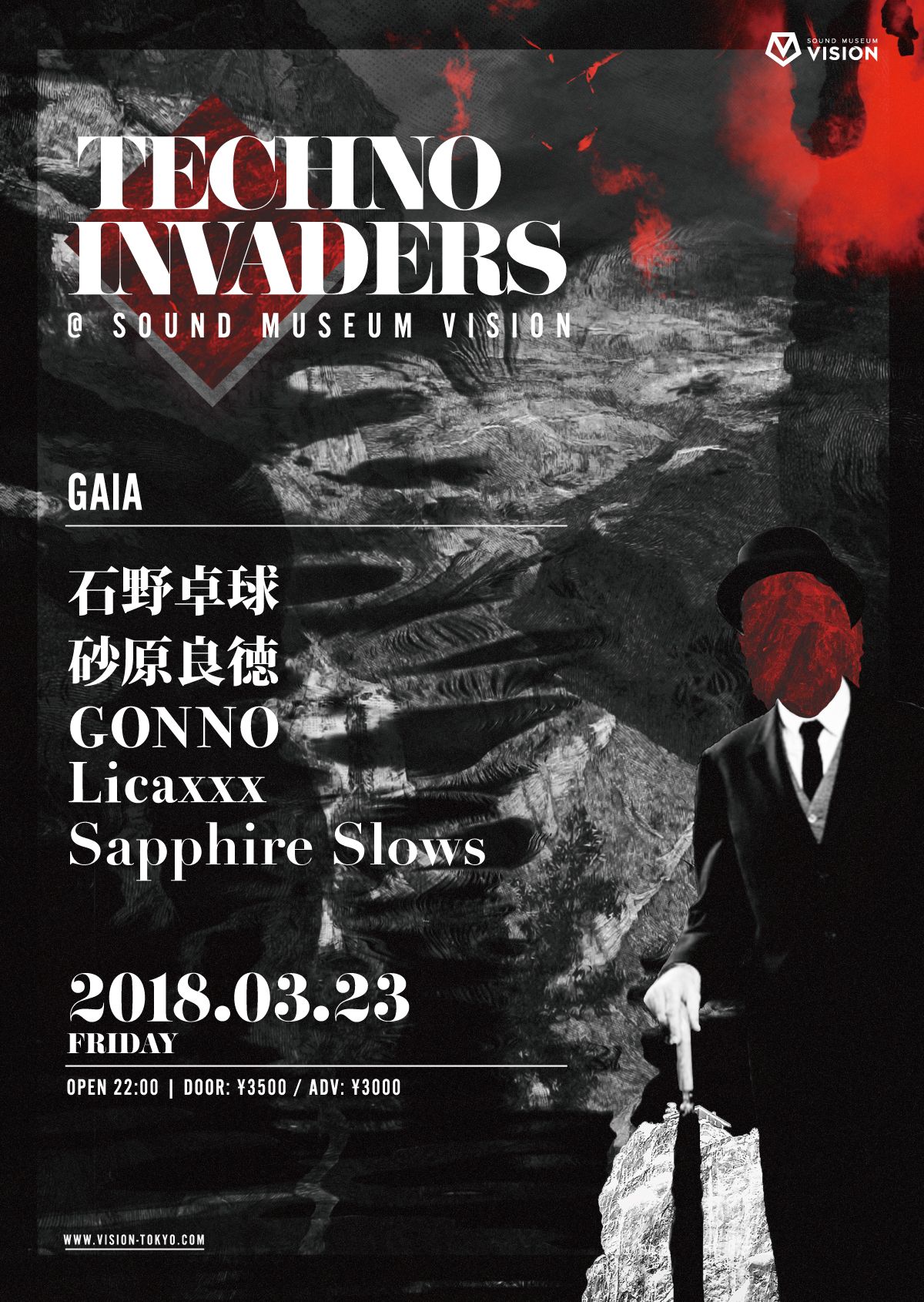 今年1月に35年間のWORKS集『Takkyu Ishino Works 1983~2017』(CD8枚組)をリリースし、今なお日本テクノシーンのトップに君臨し続ける石野卓球を軸に、元電気グルーヴで、現在はMETAFIVEのメンバーである砂原良徳、DJ・ビートメーカー・エディター・ライター・ラジオパーソナリティーなどマルチな才能をみせるLicaxxxと、TECHNO INVADERSには欠かせないラインナップが揃った。