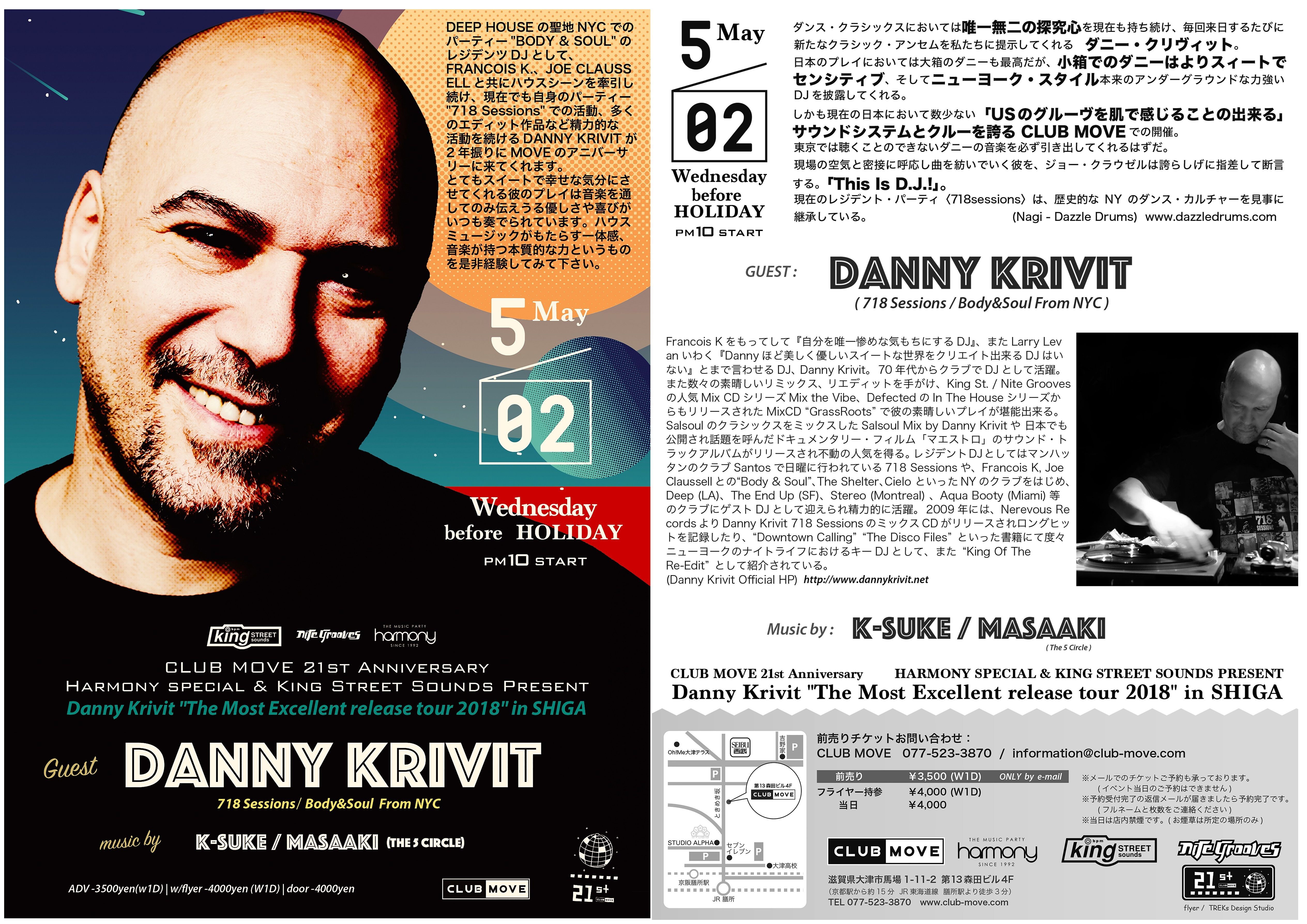しかも現在の日本において数少ない「USのグルーヴを肌で感じることの出来る」サウンドシステムとクルーを誇る CLUB MOVEでの開催。東京では聴くことのできないダニーの音楽を必ず引き出してくれるはずだ。現場の空気と密接に呼応し曲を紡いでいく彼を、ジョー・クラウゼルは誇らしげに指差して断言する。