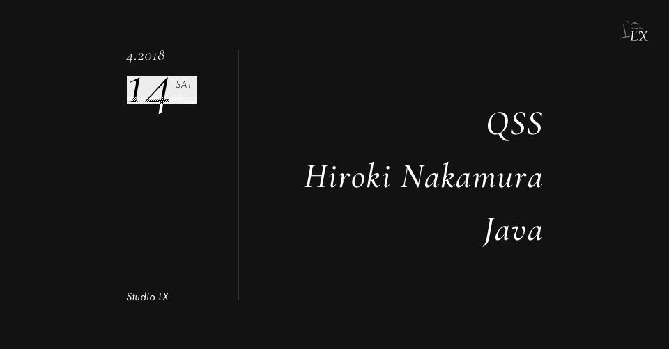 2018.04 14 APR Studio LX Saturday HOUSE DEEP HOUSE TECH HOUSE 0 Shares Facebook Twitter google Line DATE: 2018-04-14 SAT OPEN: 22:00 VENUE: PRICE: Free LINE UP: QSS,Hiroki Nakamura,Java http://leading-x.com/