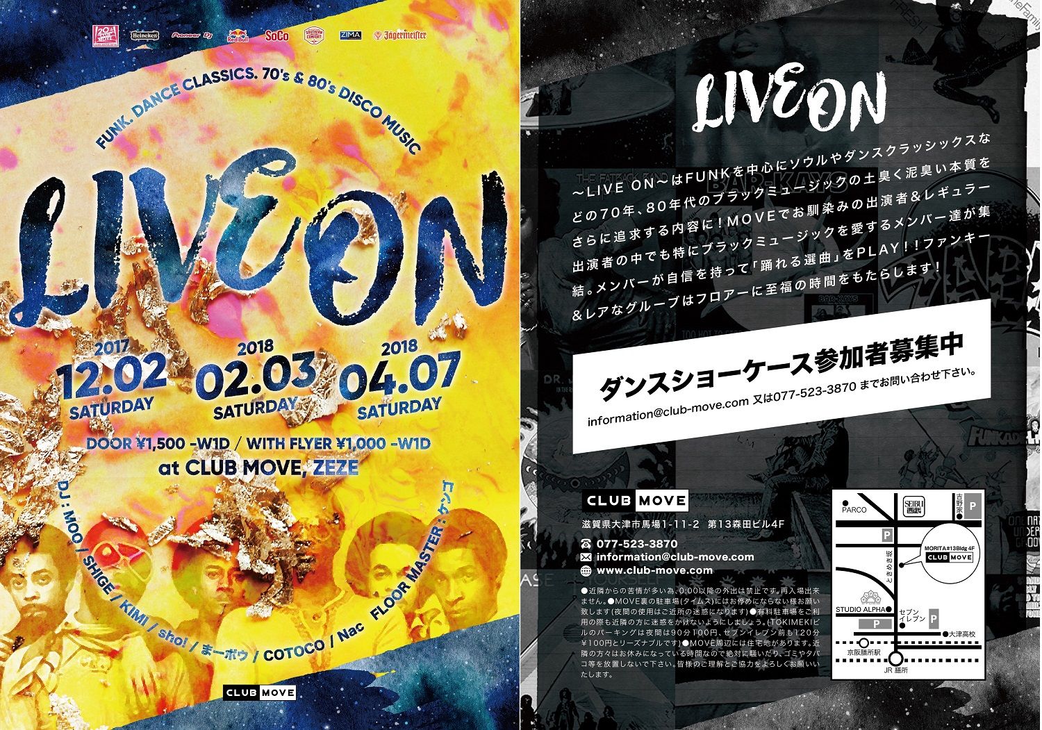 ~LIVE ON~はFUNKを中心にソウルやダンスクラシックスなどの70年、80年代のブラックミュージックの土臭く泥臭い本質をさらに追求する内容に!MOVEでお馴染みの出演者 & レギュラー出演者の中でも特にブラックミュージックを愛するメンバー達が集結。メンバーが自信を持って「踊れる選曲」をPLAY!!ファンキー & レアなグルーブはフロアーに至福の時間をもたらします!