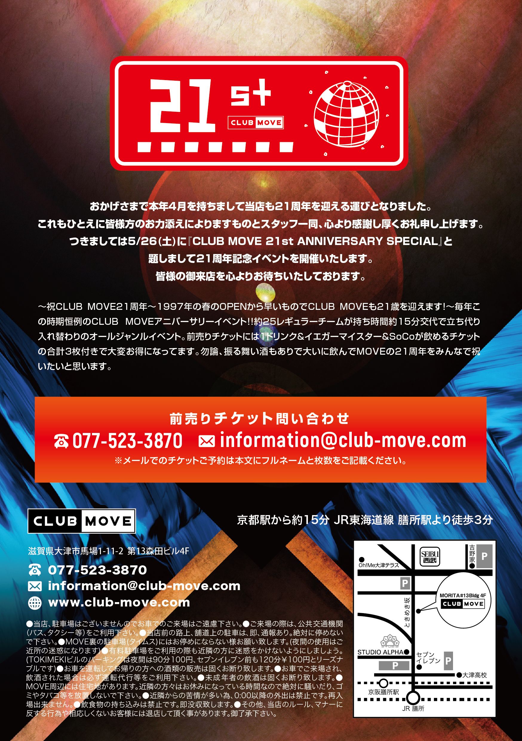つきましては5/26(土)に『CLUB MOVE 21 st ANNIVERSARY SPECIAL』と題しまして21周年記念イベントを開催いたします。皆様の御来店を心よりお待ちいたしております。