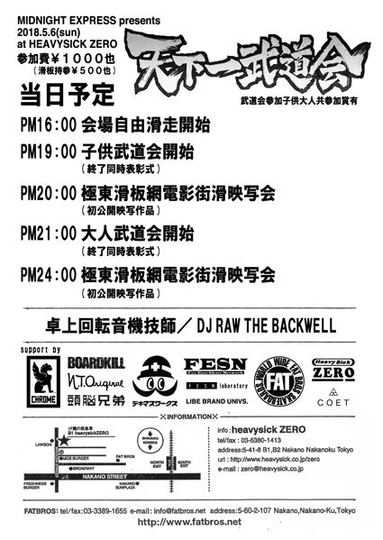 毎月開催中の「Midnight Express」。05月はゴールデンウィークスペシャルとして05月06(日)に開催!頭脳兄弟が作る世界最小スケートパークにてスケボーコンテスト『天下一武道会』を開催致します。優勝者には、CHROME(クローム)、FATBROS、FESN/LIBE、COETより豪華賞品あり!!コンテスト参加者全員にプレゼントもあり!また当日は、「FESN初公開映像」=『極東滑板網電影街滑映写会』も同時開催!