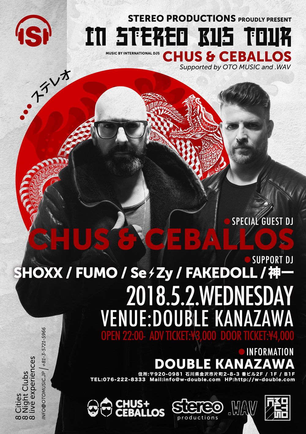 2018年ゴールデンウイークに、STEREO PRODUCTIONSでおなじみのCHUS & CEBALLOSが、 遂に日本初BUS TOURを各会場が主催となり全国8箇所8公演にて開催決定!