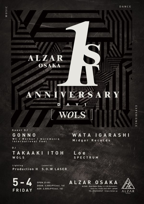 DAY1となる5月3日はALZARのオープン以来、一貫して音の根底にあるダークネスを表現し続けてきた関西老舗オーガナイズチーム"SPECTRUM"が手掛ける至極のディープテクノパーティー『WOLS』とのコラボレーションが実現!!日本が世界に誇るアンダーグラウンドテクノのパイオニアTAKAAKI ITOHと、前衛芸術のクイーンこと草間彌生の姪孫DJ LOEを軸に、日本の次世代ハウス/テクノを代表する旗手として、幅広くストーリー性溢れるプレイで先鋭的に活躍するGonno、さらにはBerghain, Bassiani, De Schoolなどの海外の主要クラブでのパフォーマンスを経て、今世界から大きく注目を浴びるDJ兼プロデューサーのWata Igarashiが登壇する。