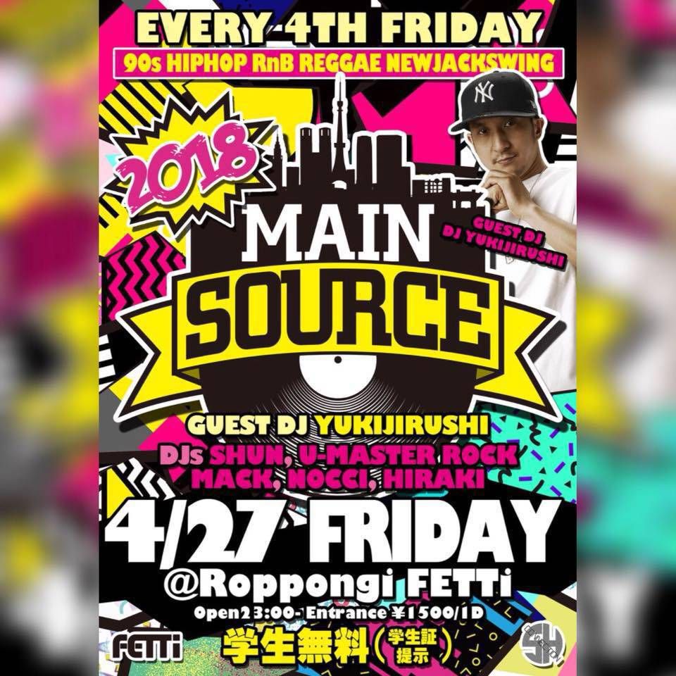 4/27は六本木Fetti第四金曜日のお楽しみ、90's Only Party【Mainsource】!今回はゲストにDJ ユキジルシ!DJ Mackも参戦で盛り上がること間違いなし!常連さんも、初めての方も楽しめるワイワイイベント!月に1度はクラシックの雨を浴びよう!学生さんは学生証持参で入場無料です!