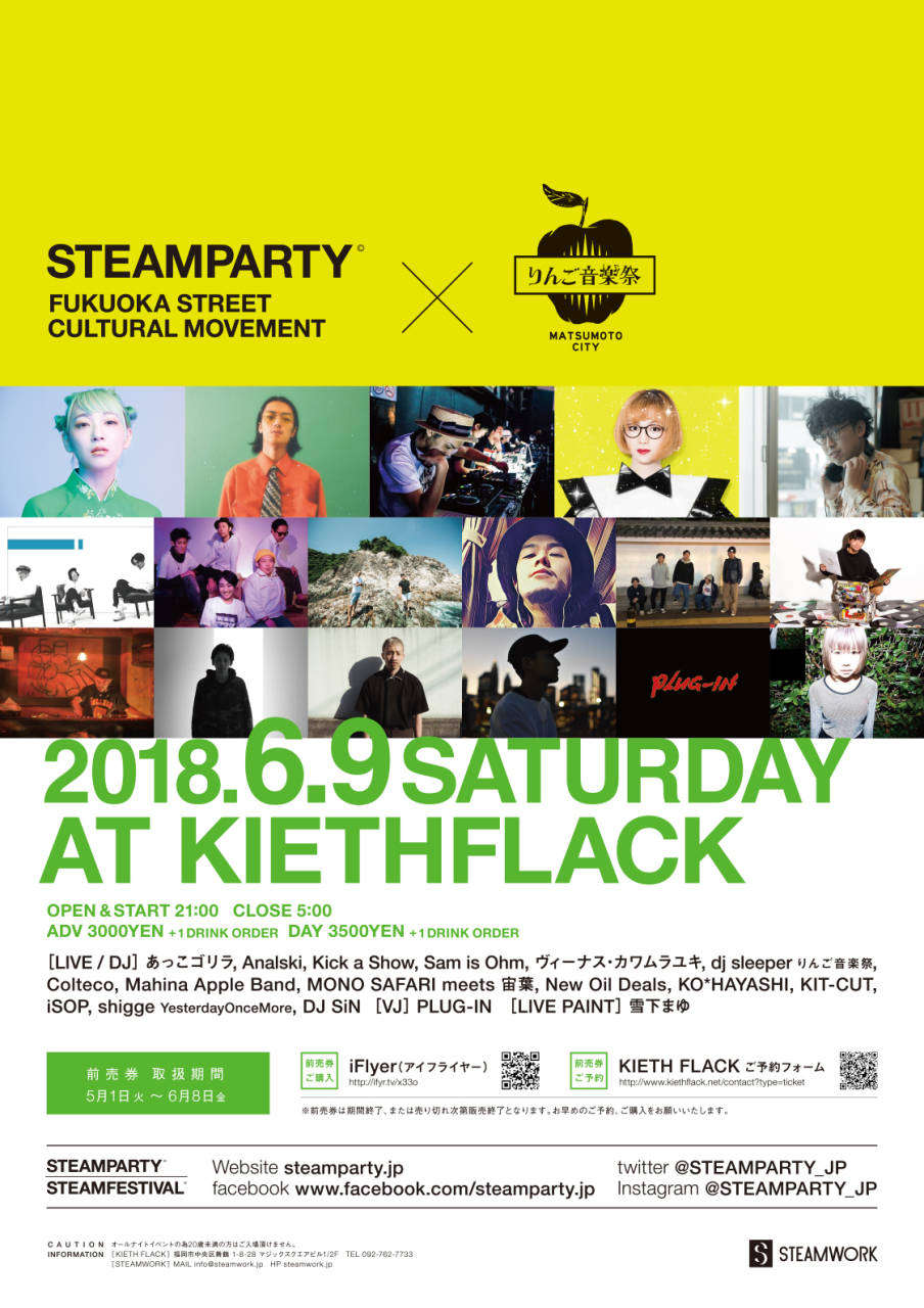 2017年は、地方のパーティースタイルとしては類をみない5ヶ所の巡る全国ツアーを敢行、各都市にフクオカ・ストリートの片麟を示し、福岡は、春吉のデザイナーズホテルであるIL PALAZZOにて、ツアー集大成として「STEAMFESTIVAL」を盛大に開催した。約4ヶ月のブランクを経て開催される今回は、もはや盟友とも言えるりんご音楽祭とのコラボレーション。斬新なラインナップからも垣間見えるSTEAMPARTYの新たなチャレンジマインドが、フクオカ・ストリートをさらに熱くする!(text by EDOMACHI)