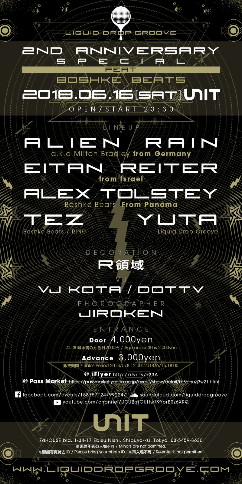 2016年9月ドミューンでスペシャル番組と八丈島のテイクオフパーティにて狼煙をあげた、YUTA率いるシーンの異端テクノレーベルLiquid Drop Grooveの2周年を祝う "2nd Anniversary Special Feat Boshke Beats" 開催決定!