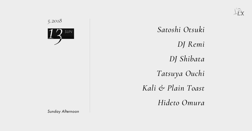 2018.05 13 MAY Studio LX Sunday Afternoon TECHNO HOUSE DEEP HOUSE MINIMAL 0 Shares Facebook Twitter google Line DATE: 2018-05-13 SUN OPEN: 18:00 VENUE: PRICE: Free LINE UP: Satoshi Otsuki,DJ Remi,DJ Shibata,Tatsuya Ouchi,Kali & Plain Toast,Hideto Omura https://www.facebook.com/events/218888538874794/