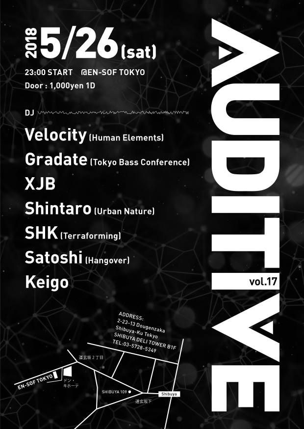 En-Sof Tokyoを拠点に多彩なベースミュージックを心地よい空間と音響でお届けするイベントAuditive。第17回目となる今回は、東京アンダーグラウンドシーンで活躍している個性豊かなドラムンベースDJ陣を招いて、多彩なバイブで一夜を飾る。