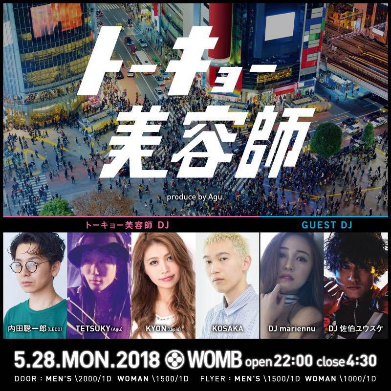有名アーティストに次々とヒットソングを楽曲提供するシンガーソングライター佐伯ユウスケと Electric World Japan で唯一の女性ガールズ DJ として会場を湧かせた新世代アーティストの DJ mariennu が "トーキョー美容師" に華を飾る。