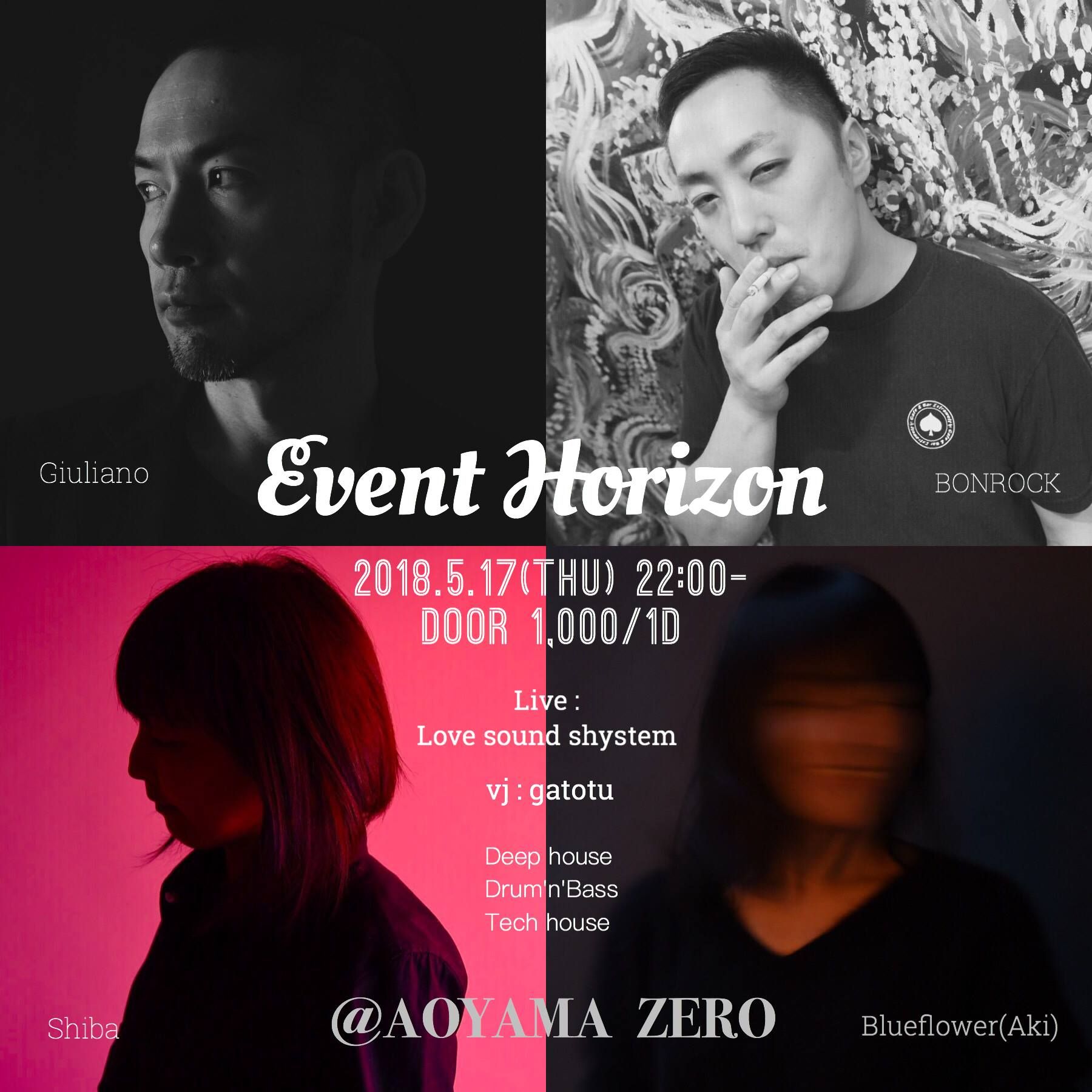 “時空の地平線”時空を超えたGoodMusicで踊る一夜。 90年代にドラムンベースユニットとして活躍した「Love soud System」が、新曲を含めたライブを披露。 GIULIANO 90年代、ジャングル・ドラムンベースムーブメントに触発されDJ活動を開始。後にブロークンビーツに傾倒し、4Hero Dego主催のパーティ2000Blackにも参加。制作においては、AYAKOとドラムンベースユニット、Love Sound Systemを結成し、ファーストミニアルバムをA.L.P.Recordsより発表。その後もSonnyのRoars Recordsからのアナログシングルのリリース、「龍が如く」キャバクラ内音楽多数のトラック等も制作。リミックスでは東京スカパラダイスオーケストラ、United Future Organization (U.F.O.)、Jaya (ex インコグニート)、Ambient7等を手がけた。SAMBA BROTHERS主催のコンピレーションに”SKINDO LE-LE”のカヴァーを提供。現在はディープハウスをメインにDJ、プロデューサーとして活動中。 Shiba 1996年DJ活動を開始。ハウスからテクノ、現代音楽まで独特の世界観と感性を持つ。過去に青山loop、中目黒solfaなどでのレギュラーイベントで出演。現在は八王子シェルターや各所にて活動中。 BONROCK 2011年DJ活動開始。同年AIRで開催されたイベントにラウンジDJとしてレギュラー出演。持ち前の誰とでも打ち解けられる個性で出演依頼が殺到。2013年からは地元千葉限定で活動を行う。自身のオーガナイズパーティー 神田Extrawelt『B』、高円寺大蔵『D』、Mediterraneo『猿』、『豆苗』、そしてMinor Bassを含む毎月5~15本のDJをこなす。最近はサウンドシステムやPAの勉強をする為、地元千葉のダーツバーBULL’SEYEと協力し、店舗のサウンドシステムを組み変えながら『SOUNDCHECK』というパーティーもスタート。現在は、Bassmusicを主に探究中。 Blueflower(aki) 80年代後期西麻布ピカソに行き衝撃を受ける。2004年から渋谷Ball、恵比寿Jam、新宿Openなど各所でDJ活動を開始。2005~恵比寿Jamにて「青い花」というpartyをToshi、Inoと共に。現在はdeephouse、tech house、Reggae、Bassmusicなどジャンルレスにセレクトする。現在は、フォトグラファー兼DJとしても各所にて活動中。