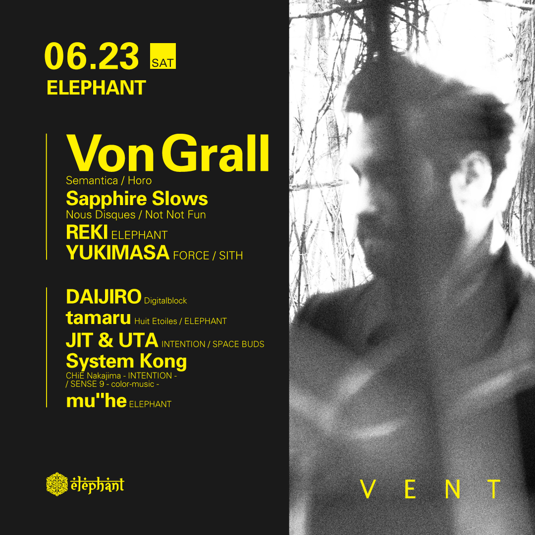 今回Von Grallが出演するのは、昨年復活した人気パーティーELEPHANT!Delsin、Clone、Rush Hourなどのレーベルからのリリースが好評なアーティストconforceをVENTに招聘し400人を越える動員数を記録し7年ぶりのパーティー復活を華々しく飾ったことも記憶に新しいだろう。国内からは2016年にバルセロナで開催されたSonarにも抜擢されるなど、海外でも精力的に活動を続け、実験的でありながらも美しく耳に残る独特な世界を作り出していくSapphire Slowsも出演が決定!