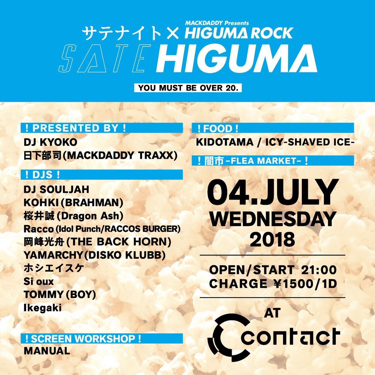 DJ KYOKO主催 "扨夜 (SATE NIGHT)"とMACKDADDY日下部司主催 "HIGUMA ROCK"による夜会、SATEHIGUMAが渋谷道玄坂駐車場地下2階Contactで催される。
