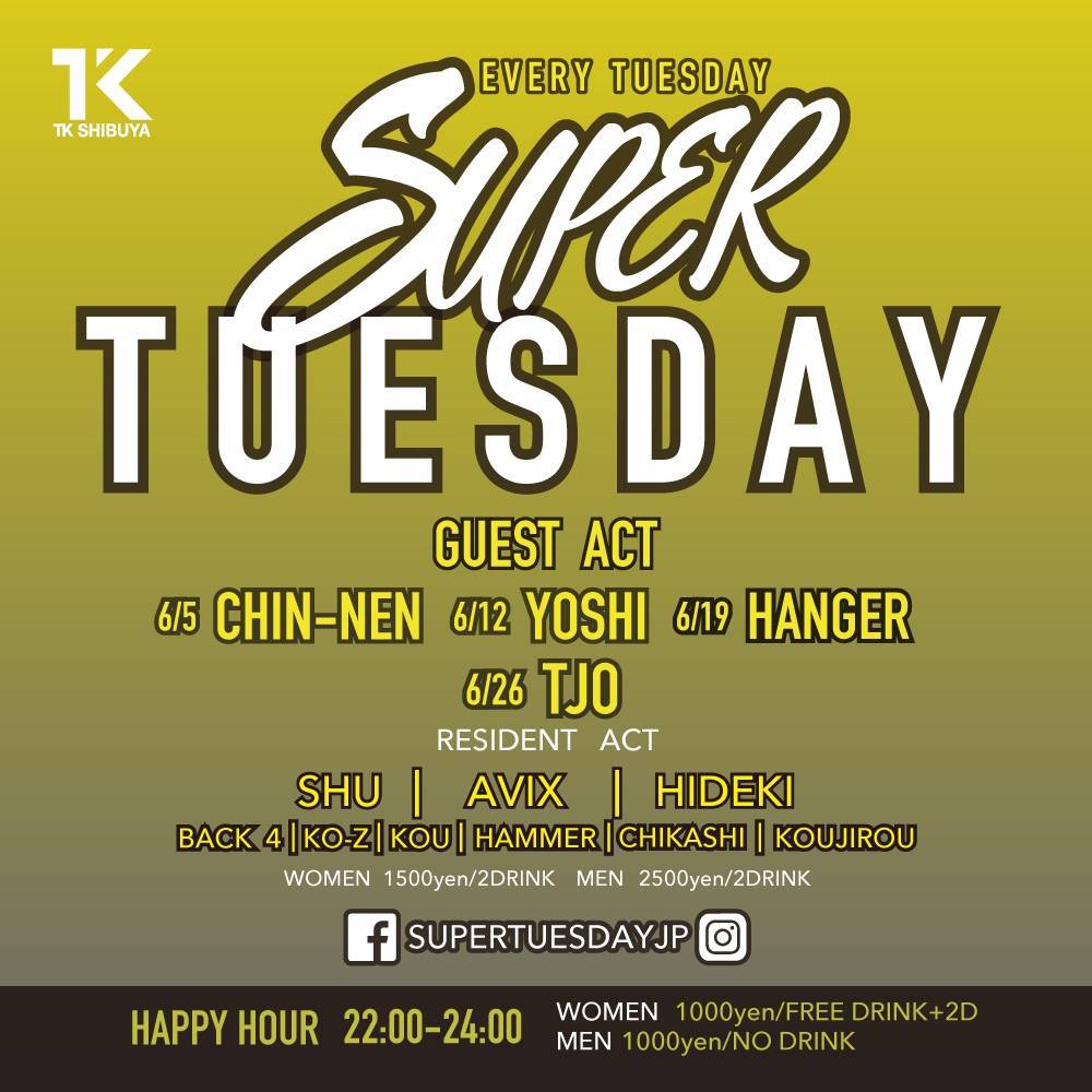 東京の遊びの中心「渋谷」の新たな遊び場「TK SHIBUYA」が、毎週火曜日に開催するパーティー「SUPER TUESDAY」!この「スパチュー」ではEDMは勿論、HIP HOPやベースMUSIC等、今、世界で主流の音楽がジャンルレスに体感できる!豪華なレギュラーDJ陣に加え毎週多彩なゲストDJを招き、他の平日では味わえない最高の夜をお楽しみ頂けます!