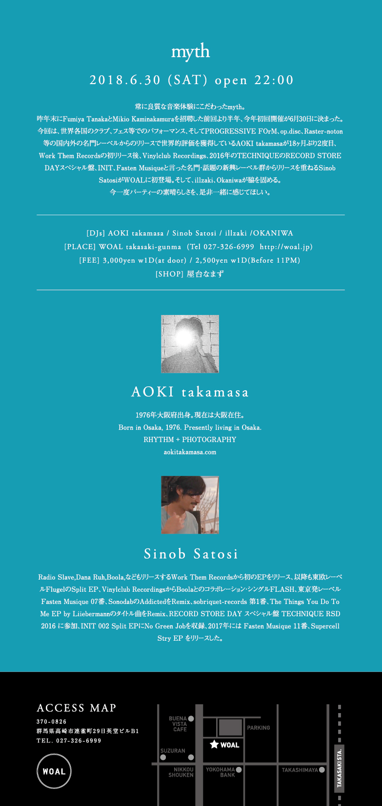 常に良質な音楽体験にこだわったmyth。昨年末にFumiya TanakaとMikio Kaminakamuraを招聘した前回より半年、今年初回開催が6月30日に決まった。